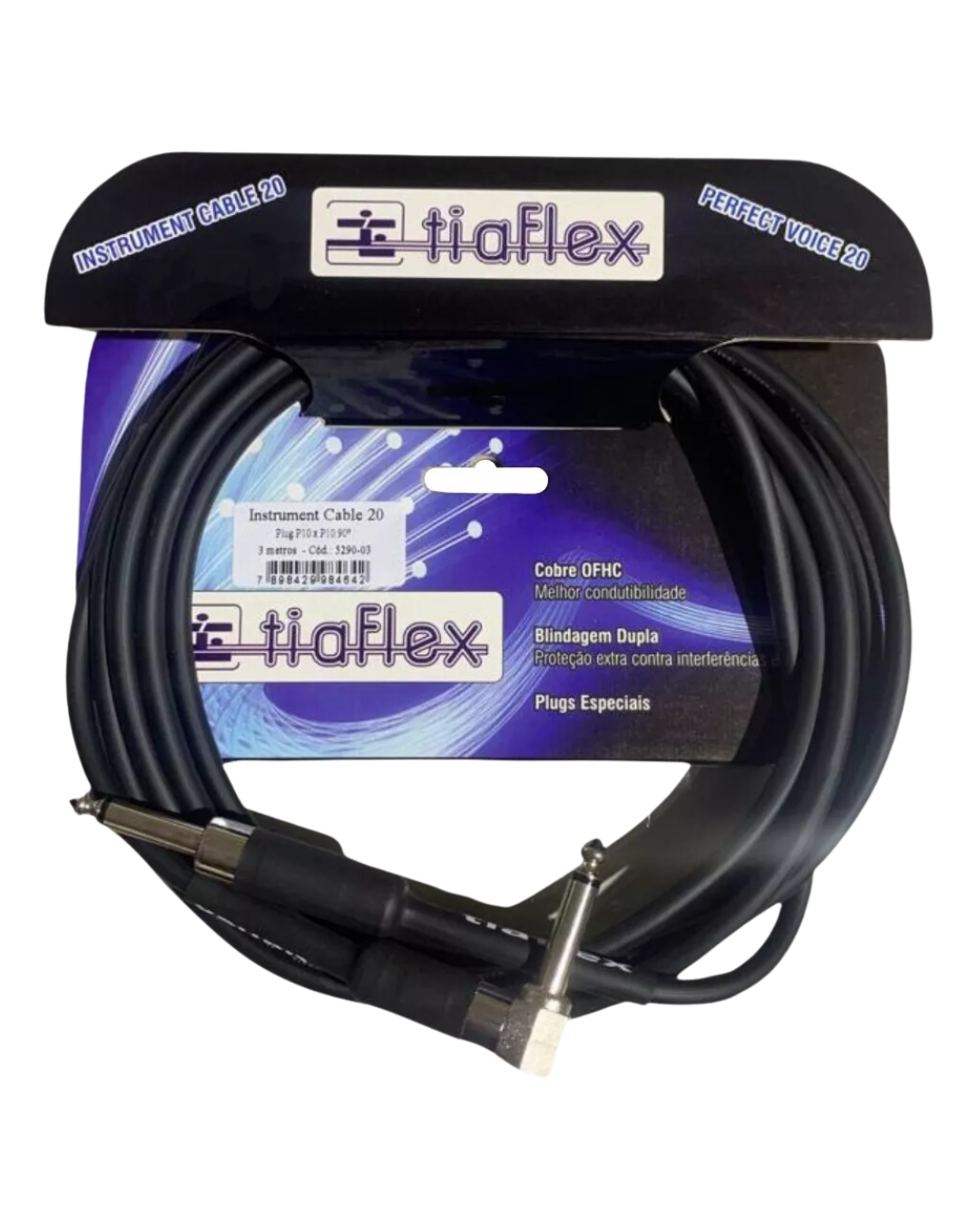 "Cabo P10/P10 90° 3 mts Tiaflex - Cabo de áudio robusto com conectores em ângulo, ideal para evitar dobras e garantir conexões seguras. Perfeito para uso em estúdios e apresentações ao vivo, com alta qualidade de transmissão de som."